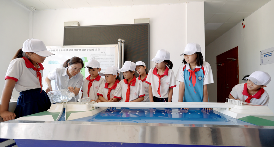 在漕河渡槽研學實踐教育基地向孩子們展示渡槽模型